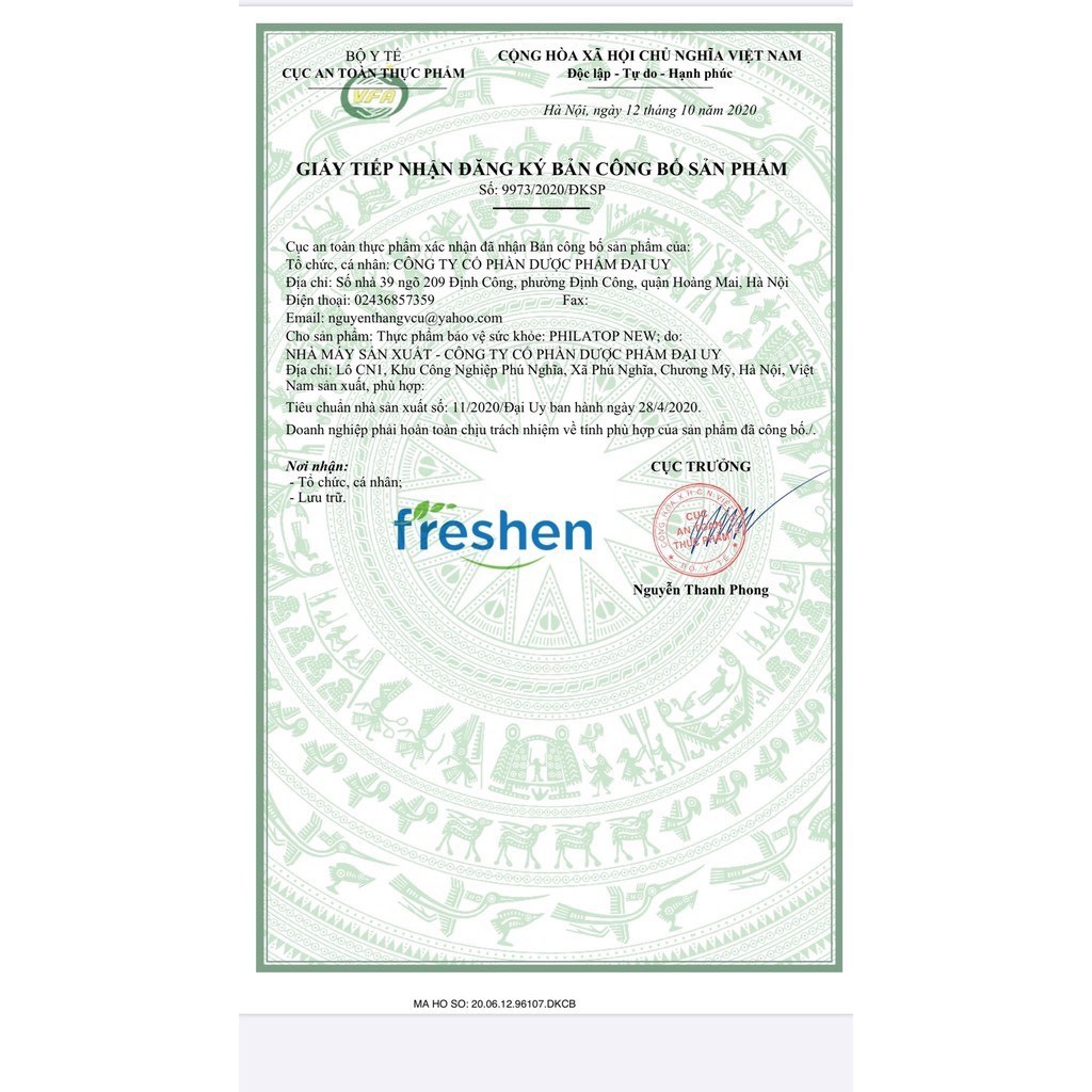 Philatop New là sản phẩm của Công ty Cổ phần Dược phẩm Đại Uy là đơn vị với hơn 10 năm kinh nghiệm trong chế biến các loại thực phẩm bảo về sức khoẻ với dây chuyền sản xuất hiện đại, đội ngũ lao động lành nghề, sản phẩm được điều chế từ nhà máy đạt chuẩn GMP quốc tế đạt đầy đủ các chỉ tiêu trong và ngoài nước và luôn là sản phẩm được người dân trên khắp 64 tỉnh thành tin dùng trong suốt nhiều năm qua.