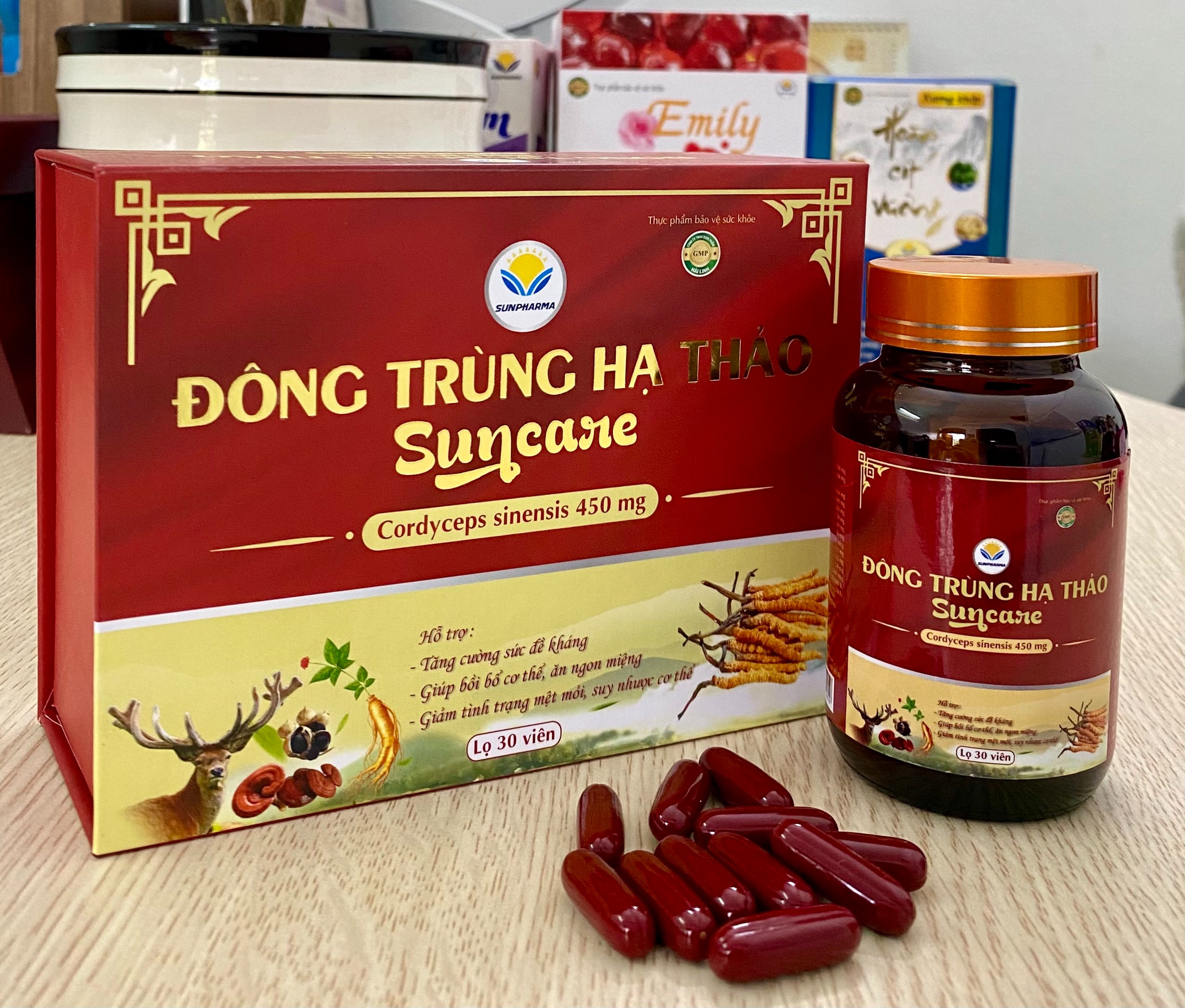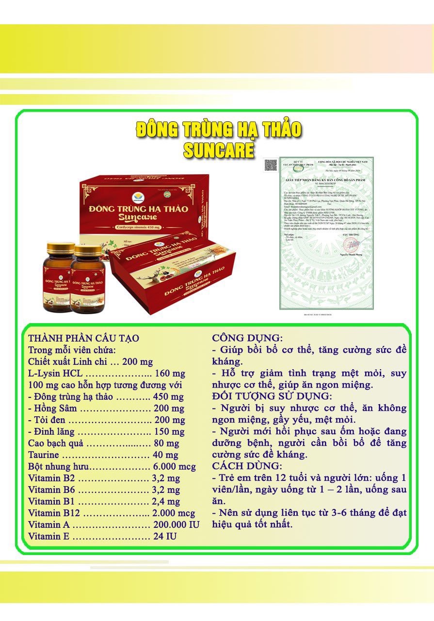 - Đặc biệt, trong Viên uống đông trùng hạ thảo Suncare có chứa thành phần đông trùng hạ thảo với hàm lượng cao.